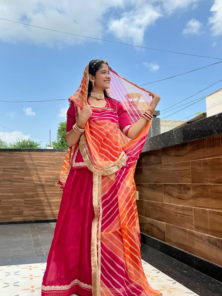 Rajputi Lahariya dress Rajasthan ki paramparik aur bahut hi sundar pehchaan hai. Iska khas pattern lehron jaisa hota hai, jo ise ek alag aur attractive look deta hai.